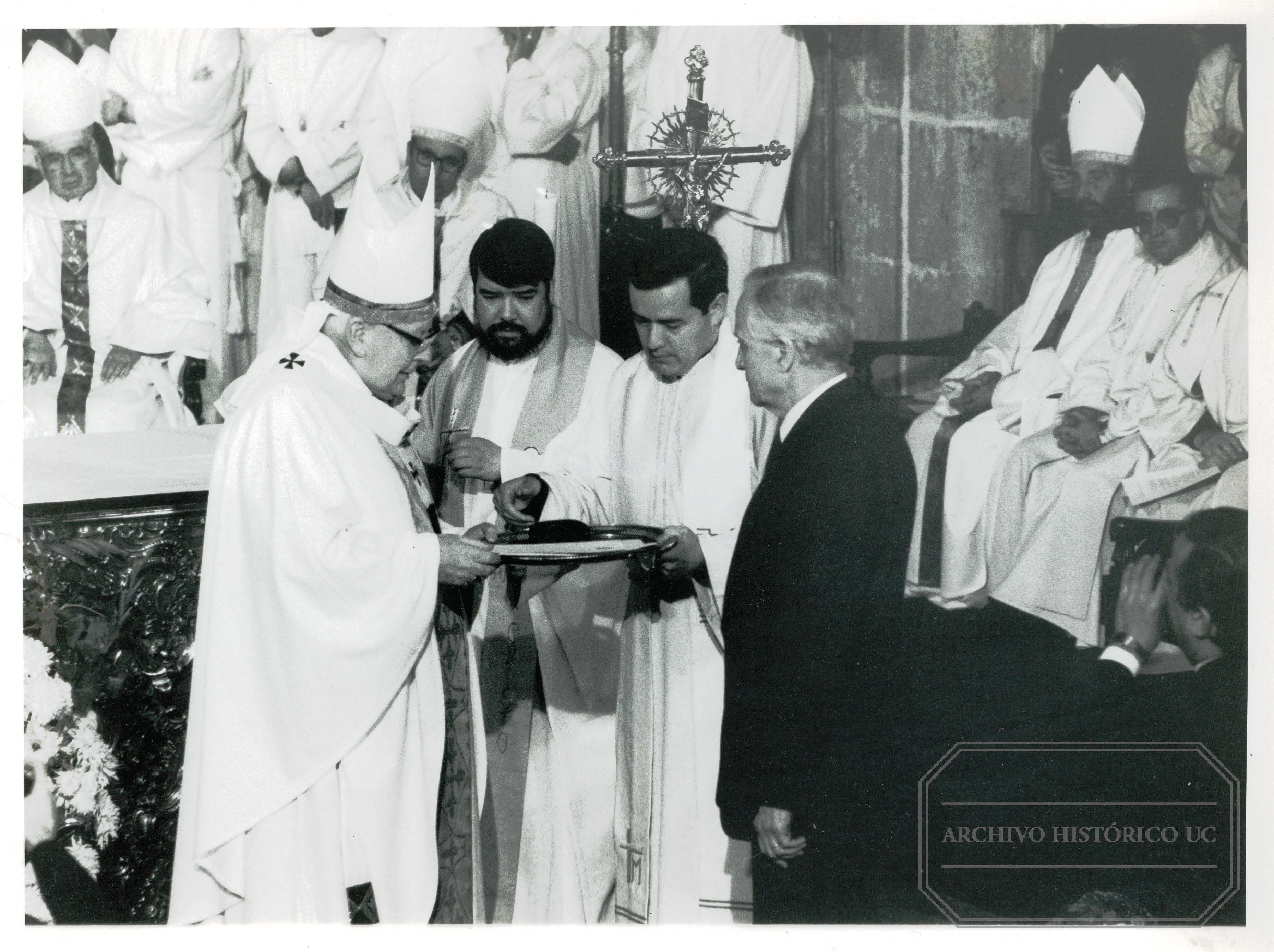 Acto de Conmemoración Día de la Universidad en el Año del Centenario Solemnidad Litúrgica del Sagrado Corazón de Jesús. El Cardenal Juan Francisco Fresno Larraín hace entrega de la carta de S.S Juan Pablo II a la Pontificia Universidad de Chile, con motivo del centenario de su fundación, acompañada de una medalla especial del Sumo Pontífice al Rector de la Universidad, profesor Juan de Dios Vial Correa, al termino de la homilía. A la derecha observa al abad del Monasterio Benedictino de Santiago, mitrado Gabriel Guarda Geywitz, O.S.D, profesor U.C. |